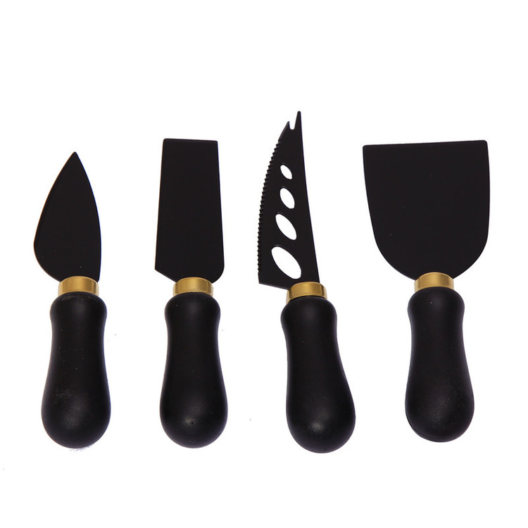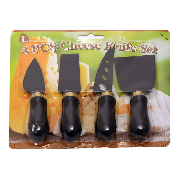 ست چاقو پنیر 4 پارچه، جنس دسته از پلاستیک فشرده به رنگ مشگی و جنس تیغه از استیل به رنگ مشگی دارای کارد اره ای سوراخ دار و کارد لبه پهن ساده و کاردک با لبه تیز جهت برش عمودی و کارد قوس دار