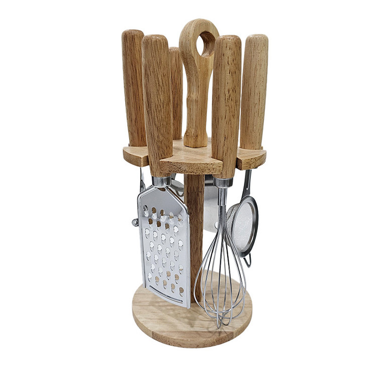 ست ابزار دسته چوبی همراه با یک استند نگهدارنده برای ابزارها، علاوه بر نظم دادن به ابزارهای مورد نیاز شما برای آشپزی، یک دکور کاربردی برای کنج آشپزخانه زیبای شما خواهد بود. این ست با وجود یک صافی چای، همزن دستی، رنده، پیتزا بر، پوست کن و ساطور اکثر نیازهای یک کدبانو را در آشپزخانه رفع خواهد کرد.