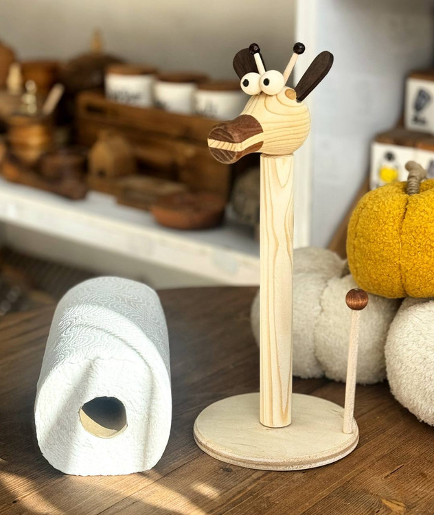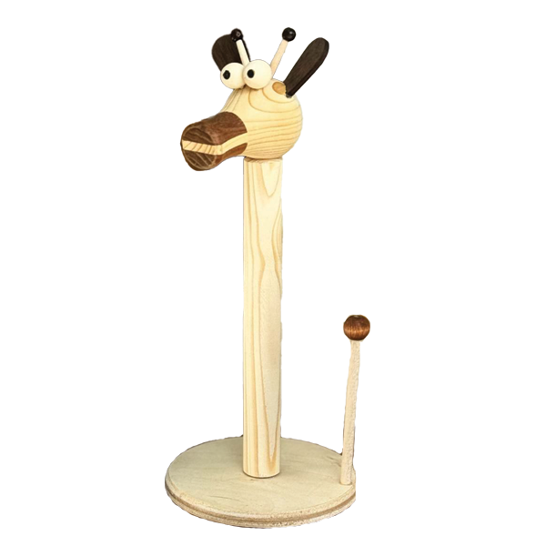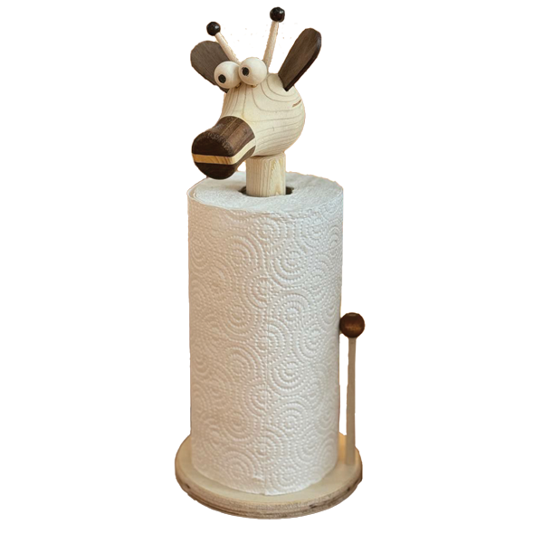 جا دستمال کاغذی رولی با طرح زرافه از چوب روس و گردو که با رنگ گیاهی پرداخت شده است. گردن این محصول قابلیت چرخش دارد. یکی دیگر از موارد استفاده این محصول این است که علاوه بر دستمال کاغذی رولی، میتوانید کیسه فریزرهای رولی را به کمک این محصول استفاده نمایید.