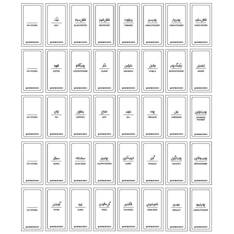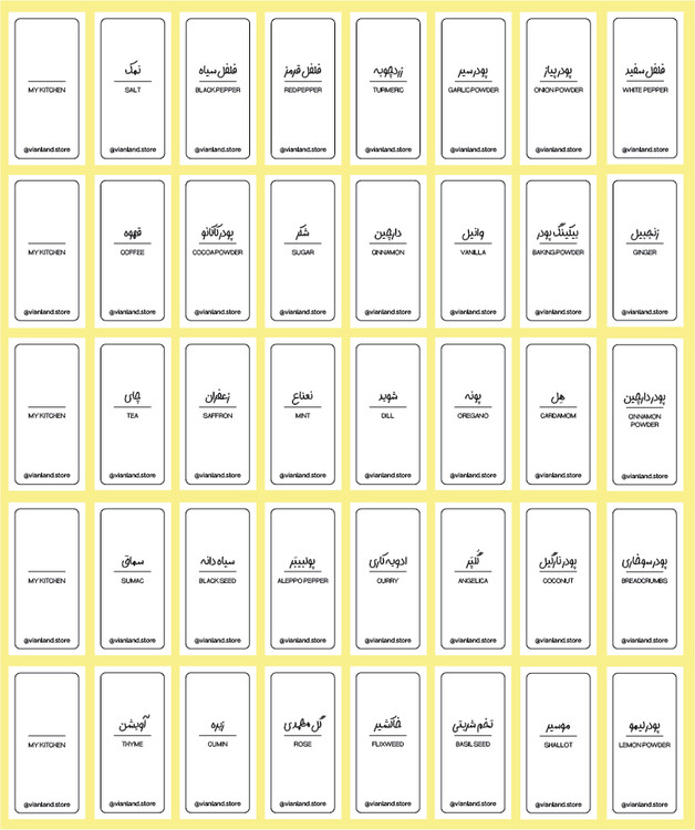 این مجموعه از برچسب ادویه مناسب انواع شیشههای ادویه و مخصوصا مدلهای مکارتی میباشد. این مجموعه شامل 35 عنوان ادویه که به طور معمول در اکثر منازل ایرانی کاربرد دارند میشود. شامل: نمک، فلفل سیاه، فلفل قرمز، فلفل سفید، زردچوبه، پودر سیر، پودر پیاز، دارچین، پودر دارچین، پودر نارگیل، زنجبیل، وانیل، بکینگ پودر، شکر، پودر کاکائو، قهوه، هل، گل محمدی، چای، زعفران، نعناع، شوید، پونه، پودر سوخاری، گلپر، ادویه کاری، پولبیبر، سیاه دانه، سماق، پودر لیمو، موسیر، تخم شربتی، خاکشیر، زیره و آویشن و همچنین 5 عدد برچسب خالی در این بستهبندی وجود دارد تا بتوانید عنوان ادویههای خاص خود را بنویسید. این لیبلها ضد آب و قابل شستشو هستند و از کیفیت خوبی برخوردارند.