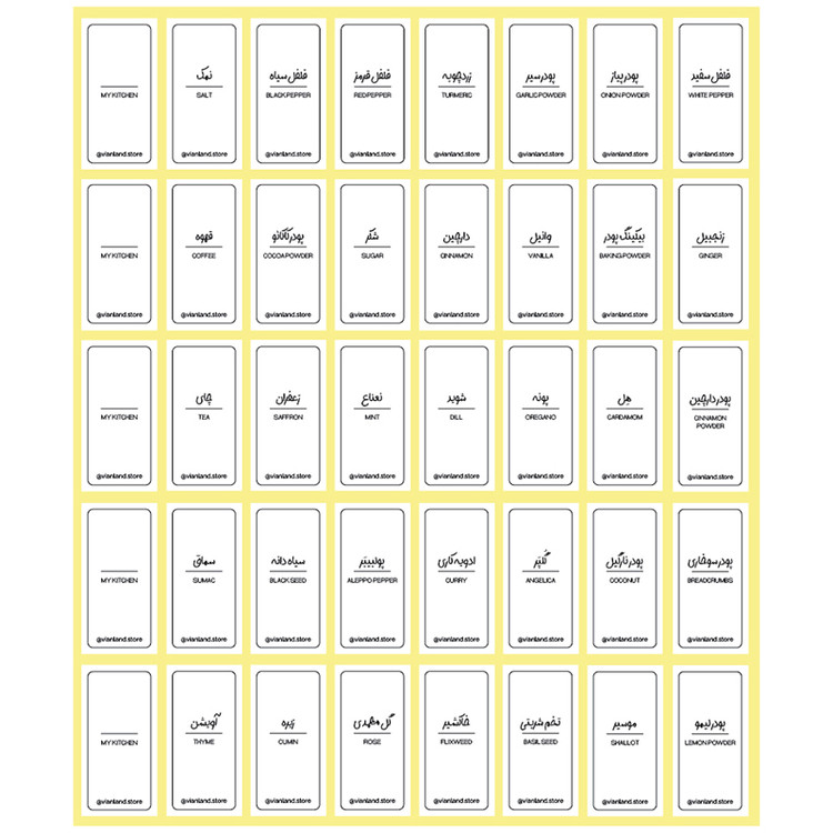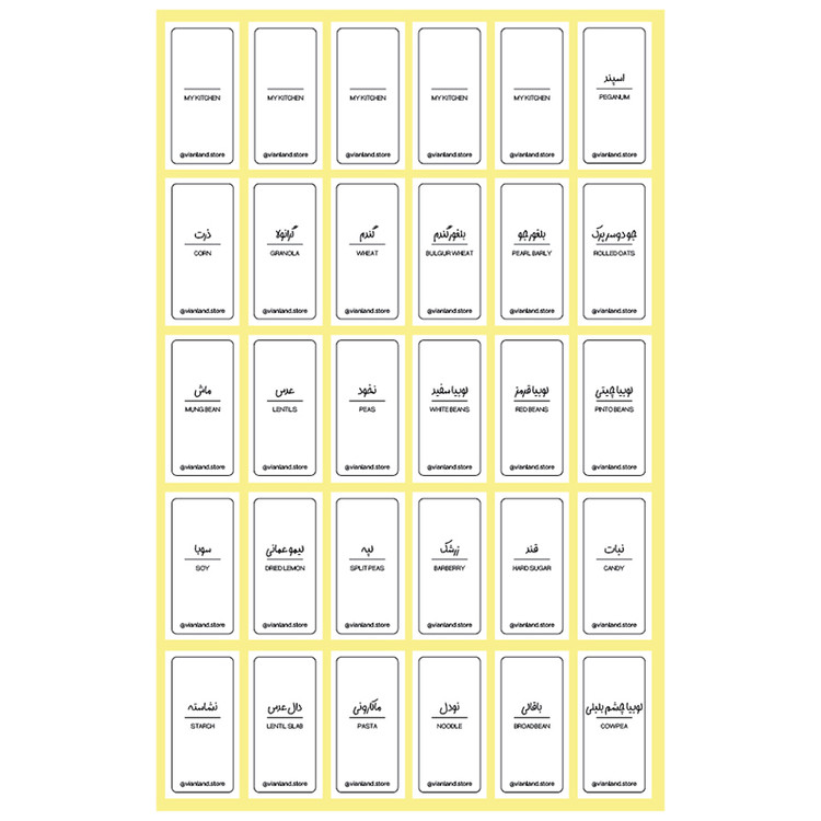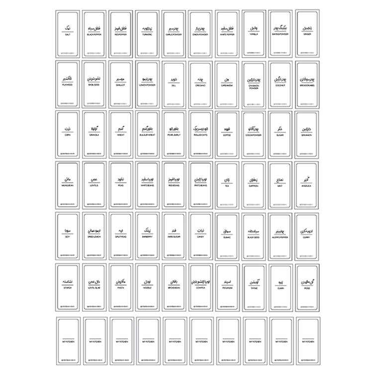 همچنین این مجموعه شامل 25 عنوان از حبوبات، غلات و مواد خوراکی که به طور معمول در اکثر منازل ایرانی برای آشپزی کاربرد دارند میشود. شامل: ماش، عدس، نخود، لوبیا قرمز، لوبیا سفید، لوبیا چیتی، لوبیا چشم بلبلی، باقالی، ذرت، لپه، دال عدس، نشاسته، ماکارونی، نودل، لیمو عمانی، قند، نبات، زرشک، سویا، گرانولا، گندم، بلغور گندم، بلغور جو، جو دوسرپرک و اسپند است. و در نهایت 10 عدد برچسب خالی در این بستهبندی وجود دارد تا بتوانید عنوان ادویه، حبوبات یا غلات خاص خود را بنویسید. این لیبلها ضد آب و قابل شستشو هستند و از کیفیت خوبی برخوردارند.