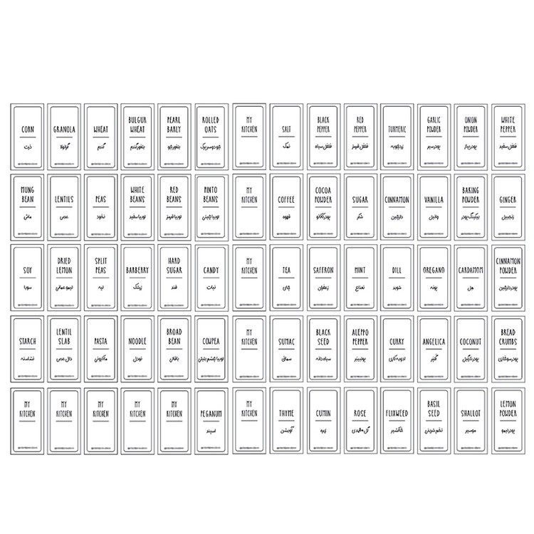 همچنین این مجموعه شامل 25 عنوان از حبوبات، غلات و مواد خوراکی که به طور معمول در اکثر منازل ایرانی برای آشپزی کاربرد دارند میشود. شامل: ماش، عدس، نخود، لوبیا قرمز، لوبیا سفید، لوبیا چیتی، لوبیا چشم بلبلی، باقالی، ذرت، لپه، دال عدس، نشاسته، ماکارونی، نودل، لیمو عمانی، قند، نبات، زرشک، سویا، گرانولا، گندم، بلغور گندم، بلغور جو، جو دوسرپرک و اسپند است. و در نهایت 10 عدد برچسب خالی در این بستهبندی وجود دارد تا بتوانید عنوان ادویه، حبوبات یا غلات خاص خود را بنویسید. این لیبلها ضد آب و قابل شستشو هستند و از کیفیت خوبی برخوردارند.
