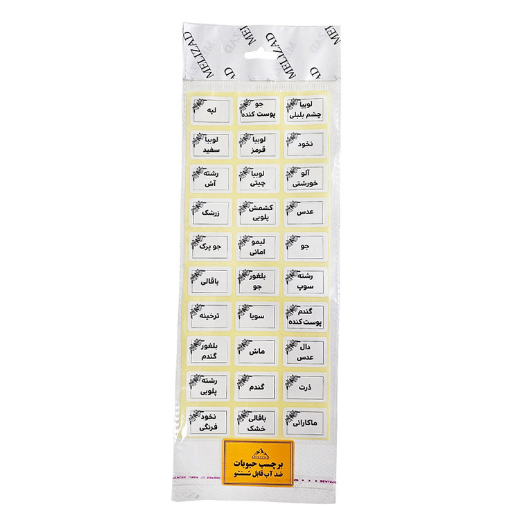 این مجموعه از برچسب حبوبات مناسب انواع شیشههای حبوبات و مخصوصا مدلهای مکارتی میباشد. این مجموعه شامل 30 عنوان از حبوبات، غلات و مواد خوراکی که به طور معمول در اکثر منازل ایرانی برای آشپزی کاربرد دارند میشود. شامل: ماش، عدس، نخود، لوبیا قرمز، لوبیا سفید، لوبیا چیتی، لوبیا چشم بلبلی، باقالی، باقالی خشک، ذرت، لپه، دال عدس، نخود فرنگی، لیمو عمانی، سویا، گندم، بلغور گندم، گندم پوست کنده، بلغور جو، جو پرک، جو پوست کنده، آلو خورشتی، رشته آش، رشته سوپ،رشته پلویی، ماکارانی، کشمش پلویی، زرشک، و ترخینه است.