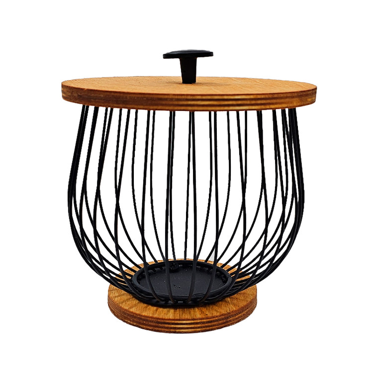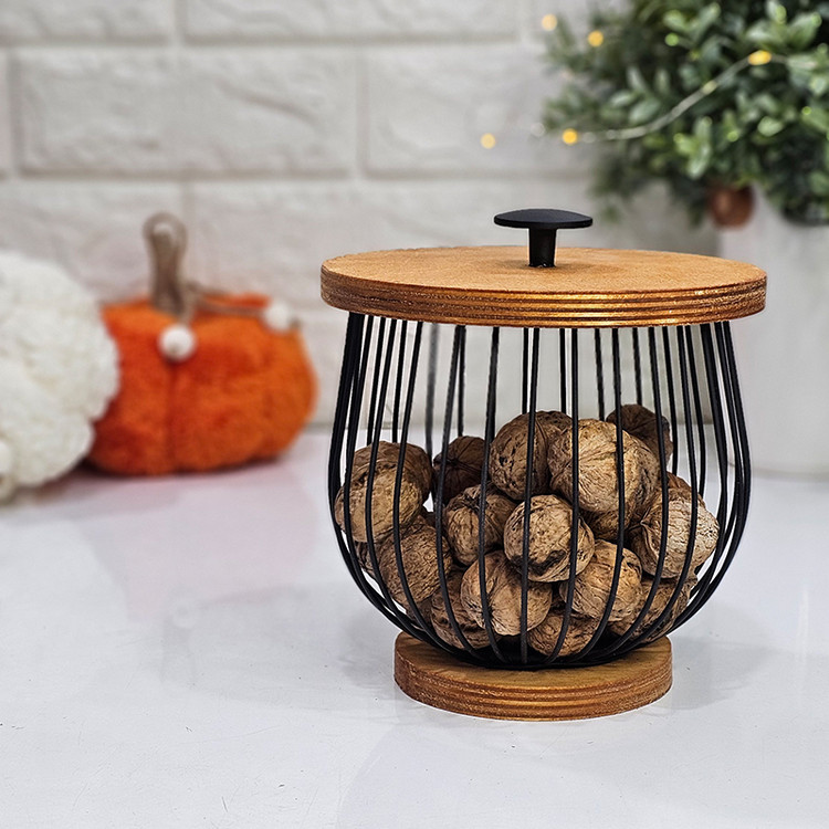 سبد آشپزخانه با طرح بلوط و درب چوبی در عین زیبایی بسیار کاربردی بوده و برای نظم دهی به گردو و بادام با ظاهری شکیل بسیار مناسب است. همچنین از این سبد میتوان به عنوان بانکه کپسولهای قهوه و یا شکلات درشت نیز استفاده نمود. این سبد با طراحی مینیمال و ساده خود، ظاهری بسیار شیک داشته و در کنار کافی بار و یا داخل آشپزخانه زیبایی خاصی ایجاد مینماید.