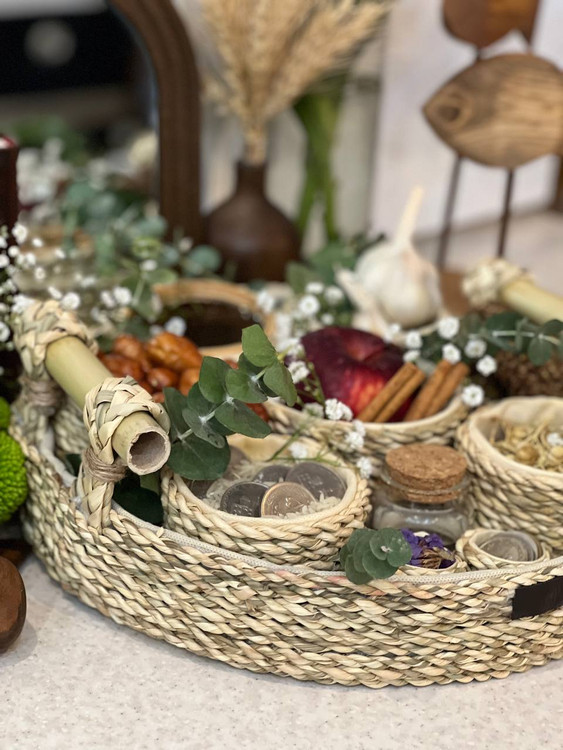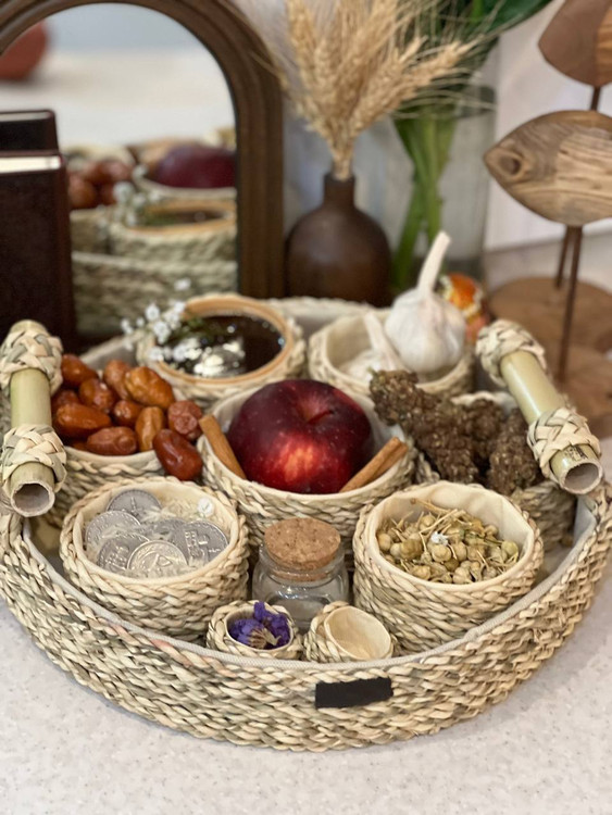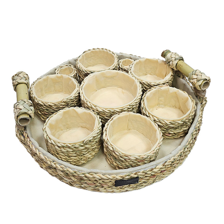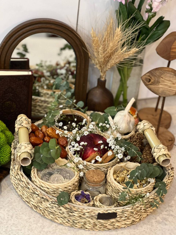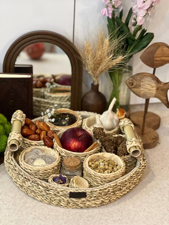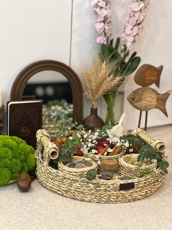 ست هفت سین مدل حصیری 10 پارچه هنر دست هنرمندان ایرانی بوده و در عین زیبایی فضای بسیار کمی اشغال میکند. با توجه به زندگیهای مدرن امروزی و کمبود فضا میتواند یکی از بهترین گزینهها برای هفت سین باشد. این ست شامل یک سینی بزرگ، یک پیاله بزرگ و 6 عدد پیاله کوچک و 2 عدد جاشمعی میباشد. داخل همه ظروف از پارچه پوشیده شده و در طول سال نیز برای تنقلات و پذیرایی قابل استفاده است.
