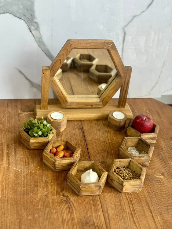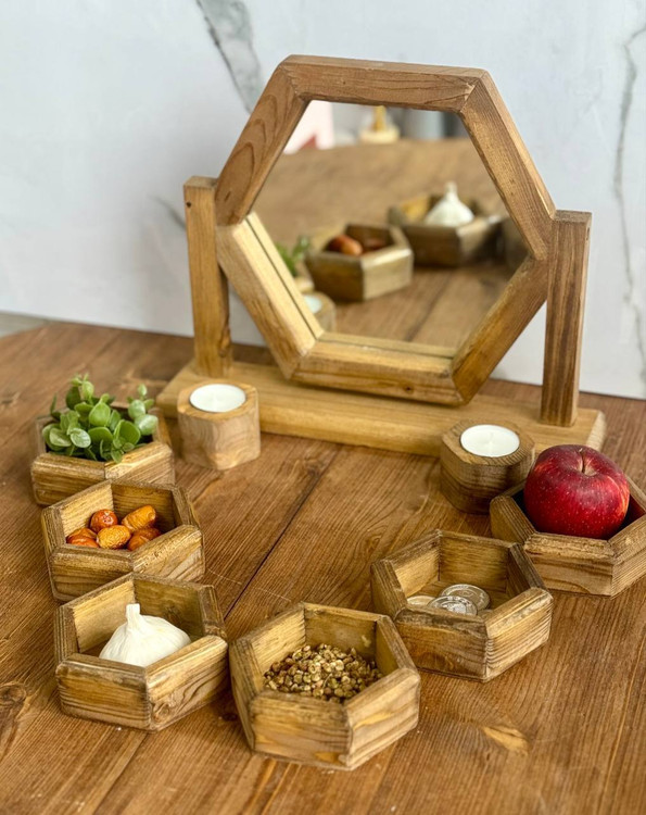 ست هفت سین ۶ ضلعی یکی از کاربردیترین و زیباترین ظروف هفت سین است که شامل یک آینه پایه دار زیبا، دو عدد جای وارمر و 6 عدد پیاله 6 ضلعی چوبی میباشد. این هفتسین اقتصادی نیاز به هیچ تزئین اضافهای ندارد اما با کمی سلیقه و گلهای زیبا هفت سین خود را تزئین کنید، حتما از شما میپرسند این هفتسین زیبا را از کجا تهیه کردهاید؟