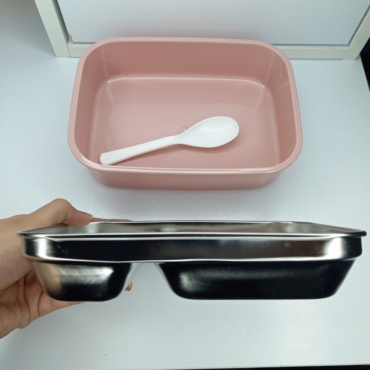 این ظرف غذا شامل یک عدد قاشق می باشد. استیل ضد زنگ و سه قسمته است. هرچهار سمت ظرف غذا باز شونده است. قسمت سرو غذا از بدنه جدا میشود. قابل استفاده در ماکروویو نیز هست.