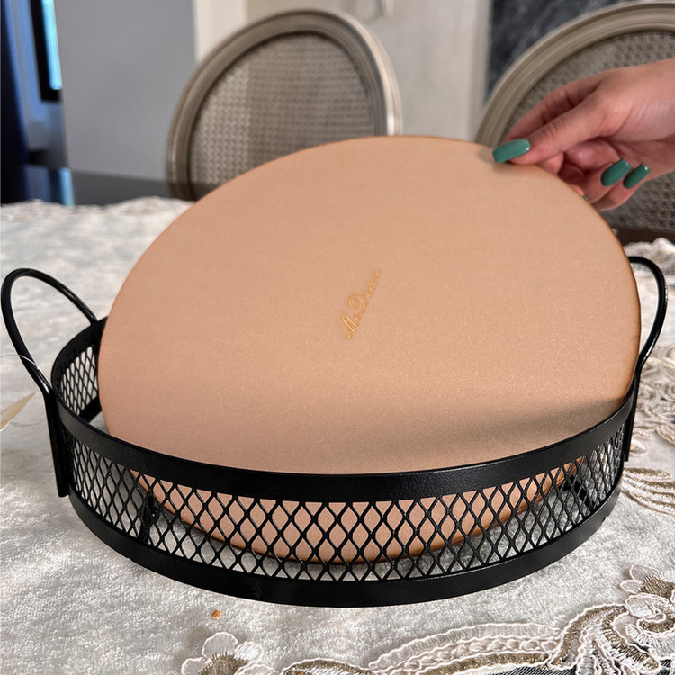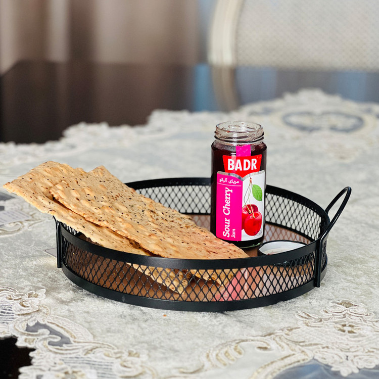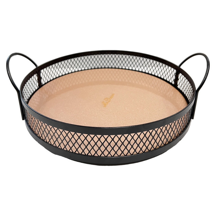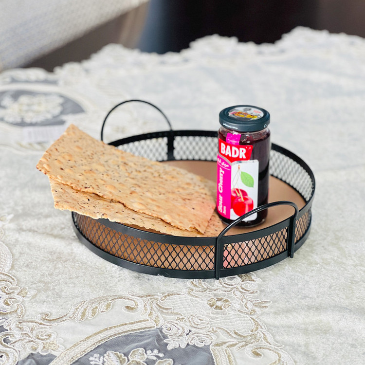 این سینی از جنس فلز با رنگ مشکی است. قطرآن 27 سانتیمتر است. دارای دو دسته متناسب با بدنه و دارای کفه چوبی متالیک طلایی با قابلیت جدا شدن است. مناسب برای نظم بخشیدن روی کابینت و … مناسب تزئین دکور آشپزخانه و نگهداری لوازم دکوری