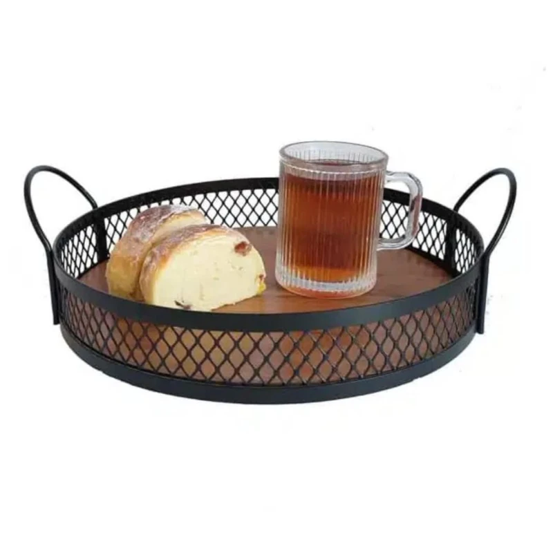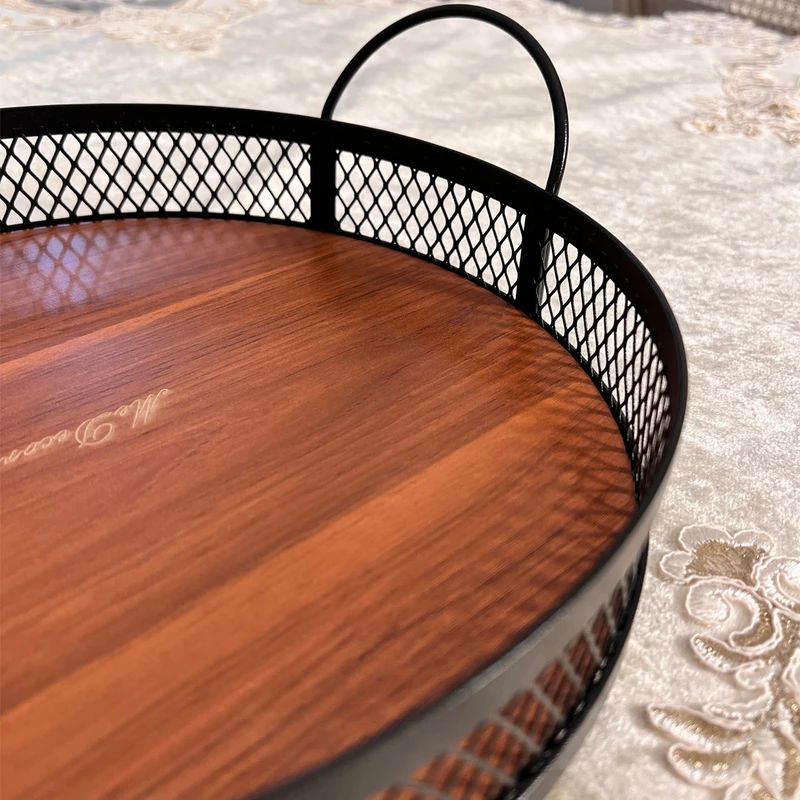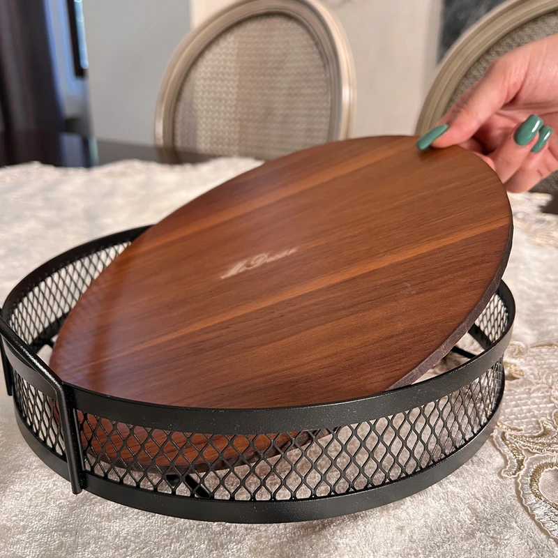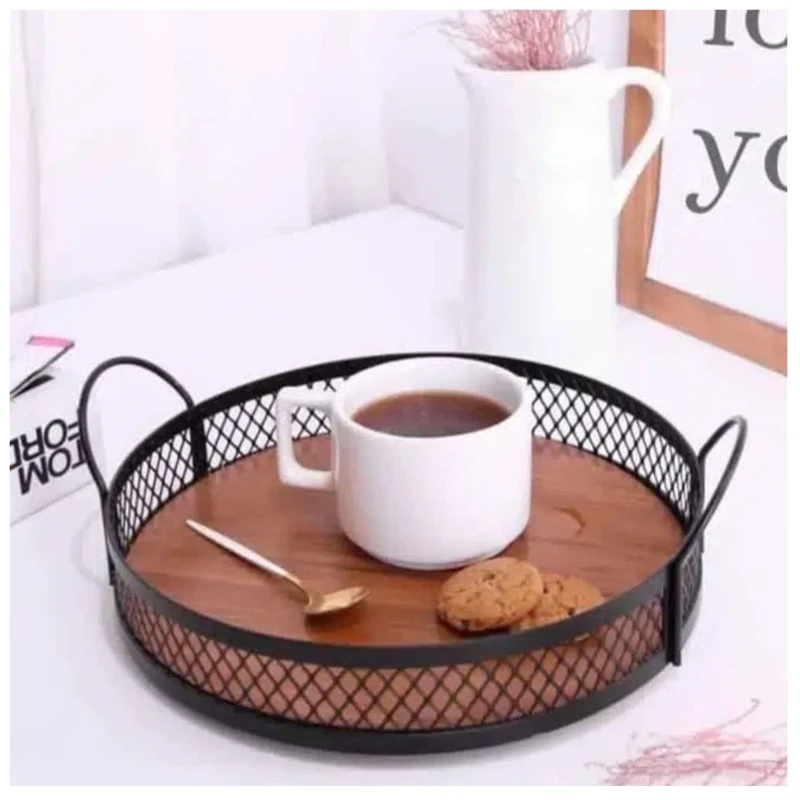 این سینی از جنس فلز با رنگ مشکی است. قطرآن 27 سانتیمتر است. دارای دو دسته متناسب با بدنه و دارای کفه چوبی متالیک طلایی با قابلیت جدا شدن است. مناسب برای نظم بخشیدن روی کابینت و … مناسب تزئین دکور آشپزخانه و نگهداری لوازم دکوری