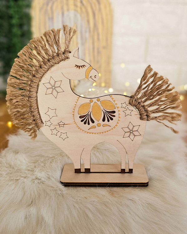 این استند جذاب و فانتزی که ترکیبی از نماد چینی سال جاری یعنی که حیوان اسب است و همچنین هنر زیبای مکرومه بافی میباشد. این نماد میتواند داخل سفرههای هفت سین جلوه زیبایی ایجاد کند. مخصوصا با رنگ طلایی درخشان کارشده روی این نماد با ظروف هفت سینی که رنگ طلایی دارند، ترکیب جذابی خواهد شد. این کار زیبا برای هدیه به عنوان عیدی هم برای کودکان و هم بزرگسالان و ههمچنین قرار دادن در پکهای تبلیغاتی و عیدانه کاری جذاب و مقرون به صرفه است.
