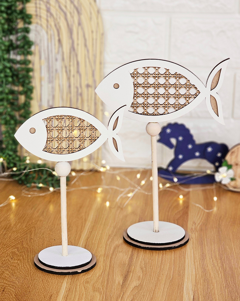 این ست تندیس ماهی هفتسین با طراحی ظریف و الهامگرفته از نقوش سنتی، جلوهای هنری و متفاوت به سفره نوروزی شما میبخشد. ترکیب چوب طبیعی، برشهای مشبک تزئینی و فرم مینیمال ماهیها، این محصول را به انتخابی خاص برای دکور عید تبدیل کرده است.