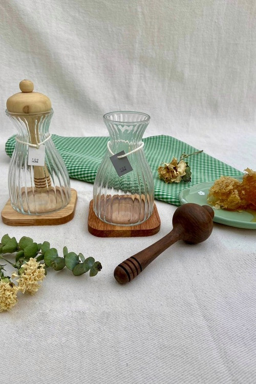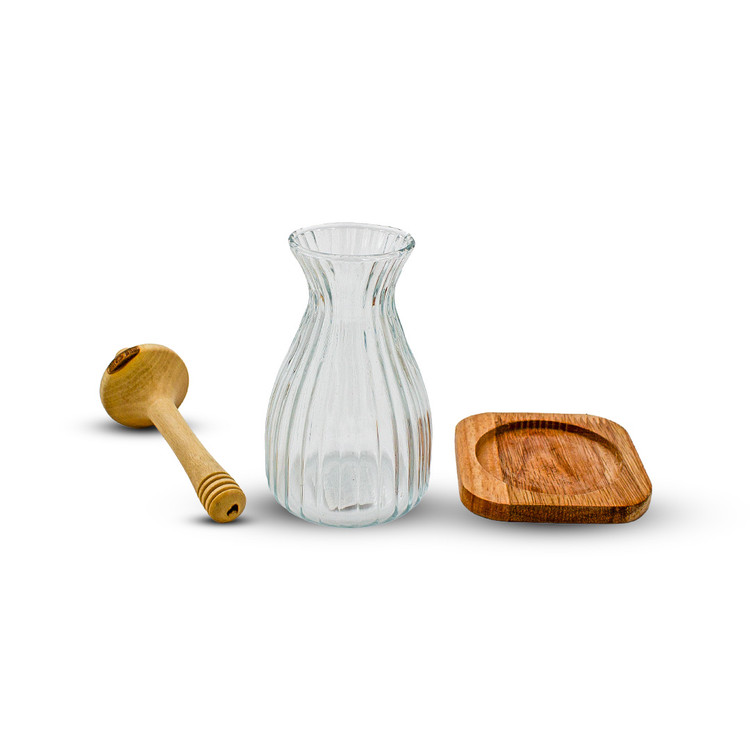 عسل خوری پیرکس شفاف و درجه یک به همراه قاشق چوبی ضخیم مخصوص عسل کالایی خوش ساخت و مصرفی که به زیبایی طراحی شده و قاشق محصول به عنوان درب محصول نیز استفاده میشود