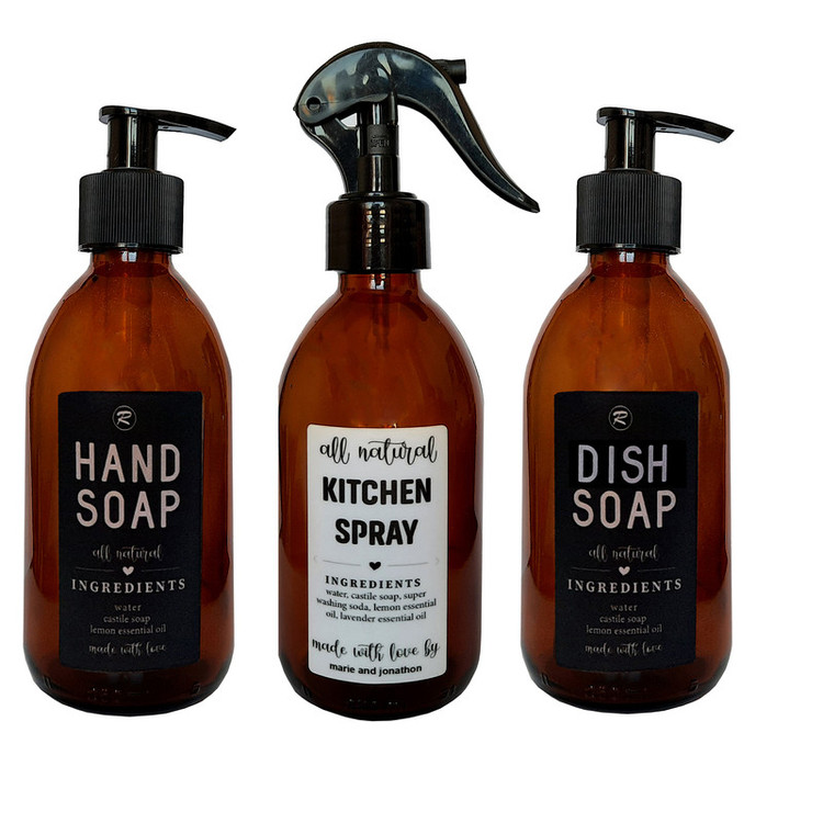 این مجموعه تولیدی پخش نوین کالا می باشد که دارای یک عدد مخزن مایع دستشویی و یک عدد مخزن مایع ظرفشویی و یک عدد ظرف اسپری افشانه می باشد . برای مصارف گوناگون در آشپزخانه مورد استفاده قرار میگیرد.این مجموعه سه عددی از جنس شیشه و رنگ لیبل ها دقیقا مطابق با تصویر می باشد.گنجایش هریک از از آنها 250 میلی لیتر و ارتفاع آنها 17 سانتی متر می باشد.
